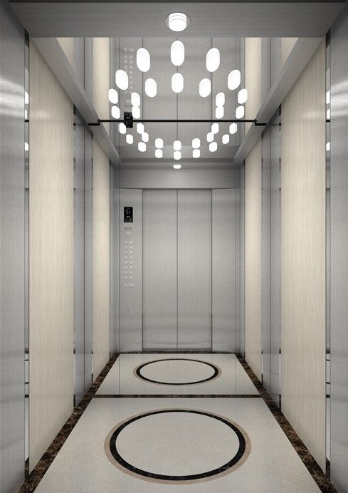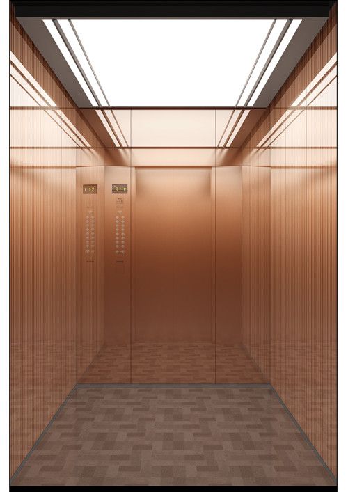 天井:噴砂不銹鋼  后側(cè):彩紋鋼板浮雕木紋+鏡面不銹鋼  左右:彩紋鋼板浮雕木紋+彩紋鋼板大理石紋+鏡面飾條  前側(cè)+轎門:香檳金鏡面  地板:PVC大理石紋