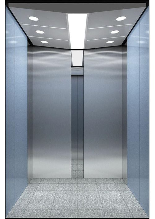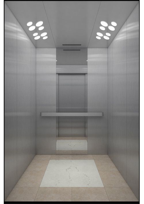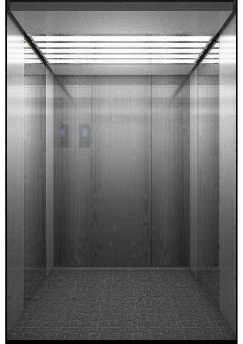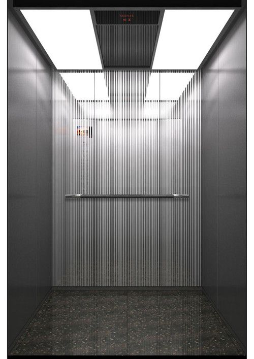 轎廂型號:YG-1623  天井:香檳砂紋板(YG-07)  兩側(cè)、后側(cè)板:兩側(cè)灰色砂紋噴涂鋼板(YG-01)+鏡面不銹鋼,后側(cè)麥點(diǎn)布紋彩紋鋼板(HK-03)+鏡面飾條  前側(cè)板、門楣:緞紋不銹鋼  轎門:緞紋不銹鋼  地板:FL-P32  操作盤:BD-D2F1