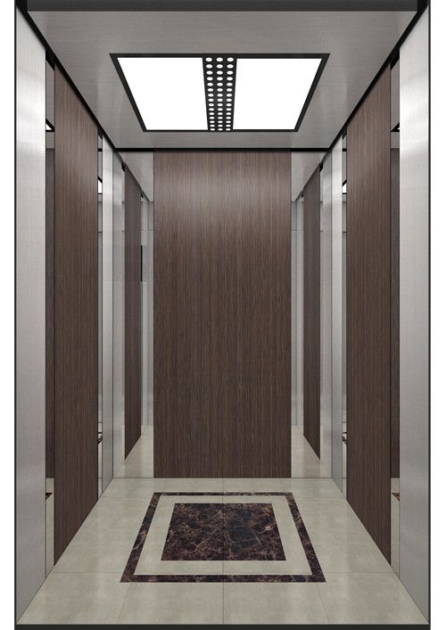 轎廂型號:YG-1632  天井:ECO-CR2金屬烤漆(YM-14)  兩側(cè)、后側(cè)板:兩側(cè)深棕木彩紋鋼板(KB19)+鏡面不銹鋼,后側(cè)深棕木彩紋鋼板(KB19)+麥點(diǎn)紋彩紋鋼板(HK03)  前側(cè)板、門楣:發(fā)紋不銹鋼  轎門:發(fā)紋不銹鋼  地板:FL-P31(砂巖米黃PVC)  操作盤:BC-D2F2