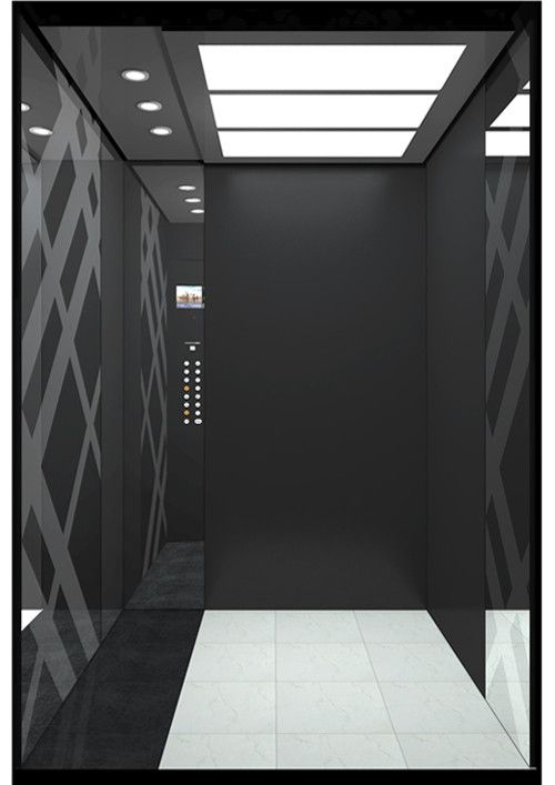 天井YLH-YL,黑色亞光鋁合金框架  前側(cè)板發(fā)紋不銹鋼  門楣發(fā)紋不銹鋼  兩側(cè)左側(cè):兩端為彩紋鋼板(KB19),中間為鏡面不銹鋼鍍黑鈦+鏡面飾條  右側(cè):兩端為彩紋鋼板(KB19),中間為鏡面不銹鋼  后側(cè)板彩紋鋼板(KB19)+鏡面不銹鋼  轎門發(fā)紋不銹鋼  操作盤BC-T8A1  扶手深色木質(zhì)直線型(MS-91)  踢腳板黑色PVC  地板PVC(YP2013)