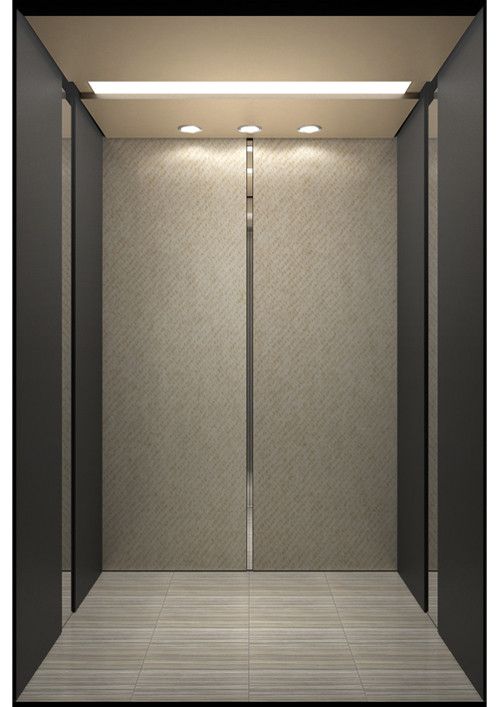 轎廂型號:YG-1622  天井:白色砂紋噴漆板(YG-05)+鏡面不銹鋼  兩側(cè)、后側(cè)板:兩側(cè)香檳色砂紋鋼板(YG-07),后側(cè)香檳色砂紋鋼板(YG-07)+深咖色砂紋烤漆板(YG-08)+鏡面飾條  前側(cè)板、門楣:緞紋不銹鋼  轎門:緞紋不銹鋼  地板:FL-P34(米黃PVC)  操作盤:BD-D2F1