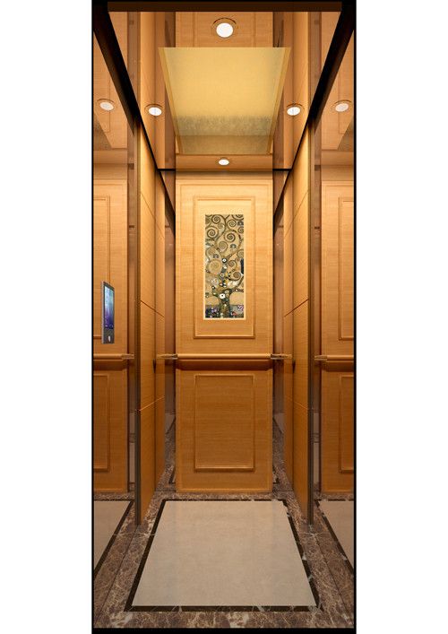 轎廂款型:富麗華庭  天井ECO-FL,鏡面不銹鋼(鍍玫瑰金)+金箔貼面  前側(cè)板鏡面不銹鋼(鍍玫瑰金)  門楣鏡面不銹鋼(鍍玫瑰金)  兩側(cè)木飾面+鏡面不銹鋼(鍍玫瑰金)  后側(cè)板木飾面+鏡面不銹鋼(鍍玫瑰金)+裝飾畫(選配)  轎門鏡面不銹鋼(鍍玫瑰金)  操作盤BC-T8A1  扶手實(shí)木+發(fā)紋不銹鋼  地板大理石拼花(西班牙米黃+金鑲玉+水晶啡)