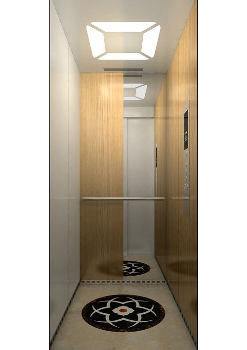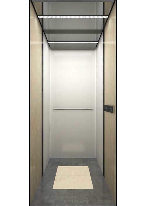 天井:木紋格柵板+金屬烤漆+鏡面封邊條  后側(cè):鏡面不銹鋼+扶手(含圓弧側(cè)板)  左右:木紋格柵板+金屬烤漆(YM-40)+鏡面封邊條  前側(cè)+轎門:金屬烤漆(YM-40)  地板:PVC地板