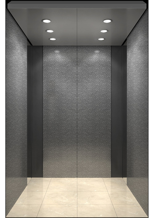 轎廂型號:YG-1621  天井:淺灰閃珠銀噴涂鋼板(YG-10)  兩側(cè)、后側(cè)板:兩側(cè)為雙灰色橘紋噴涂鋼板(YG-09),鏡面不銹鋼,后側(cè)中間片雙灰色橘紋噴涂鋼板(YG-09),其余黑色砂紋噴涂鋼板(YG-02)  前側(cè)板、門楣:緞紋不銹鋼  轎門:緞紋不銹鋼  地板:FL-P34(米黃PVC)  操作盤:BD-D2F1