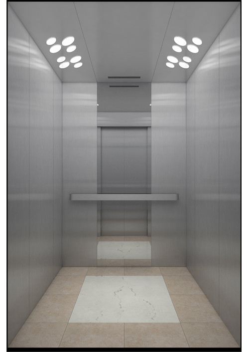 轎廂型號(hào):YG-1623  天井:香檳砂紋板(YG-07)  兩側(cè)、后側(cè)板:兩側(cè)灰色砂紋噴涂鋼板(YG-01)+鏡面不銹鋼,后側(cè)麥點(diǎn)布紋彩紋鋼板(HK-03)+鏡面飾條  前側(cè)板、門(mén)楣:緞紋不銹鋼  轎門(mén):緞紋不銹鋼  地板:FL-P32  操作盤(pán):BD-D2F1