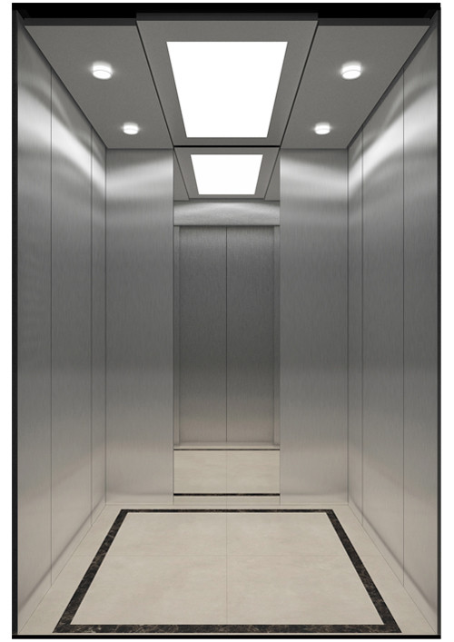 轎廂型號:YG-1623  天井:香檳砂紋板(YG-07)  兩側(cè)、后側(cè)板:兩側(cè)灰色砂紋噴涂鋼板(YG-01)+鏡面不銹鋼,后側(cè)麥點布紋彩紋鋼板(HK-03)+鏡面飾條  前側(cè)板、門楣:緞紋不銹鋼  轎門:緞紋不銹鋼  地板:FL-P32  操作盤:BD-D2F1