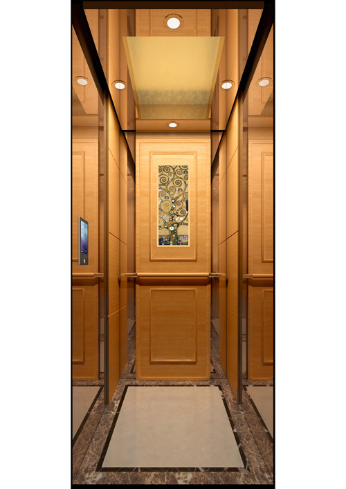 天井:噴砂不銹鋼  后側(cè):彩紋鋼板浮雕木紋+鏡面不銹鋼  左右:彩紋鋼板浮雕木紋+彩紋鋼板大理石紋+鏡面飾條  前側(cè)+轎門(mén):香檳金鏡面  地板:PVC大理石紋