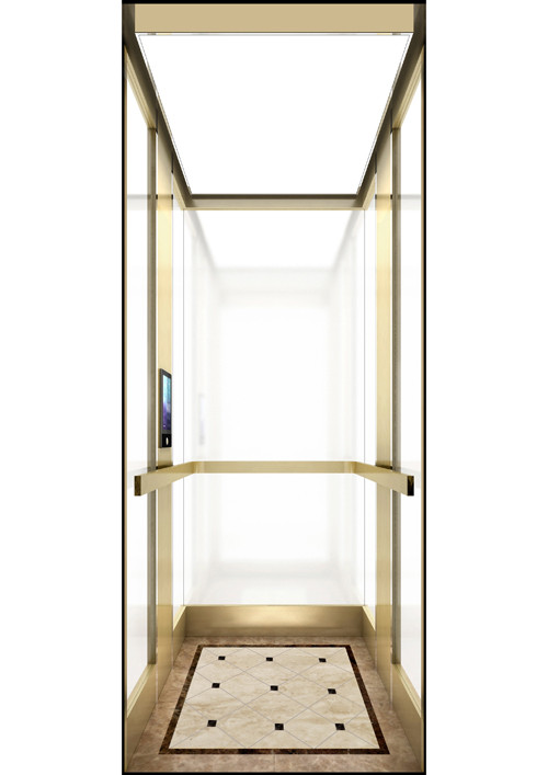 天井:全發(fā)光天井  前側(cè)板:抗指紋短絲發(fā)紋香檳金不銹鋼  門楣:抗指紋短絲發(fā)紋香檳金不銹鋼  兩側(cè):抗指紋短絲發(fā)紋香檳金不銹鋼+鏡面飾條  后側(cè)板:無邊框夾膠玻璃  轎門:抗指紋短絲發(fā)紋香檳金不銹鋼  操作盤:BC-T8A1  扶手:發(fā)紋鍍香檳金扶手  地板:大理石(黑白根+云多拉灰)